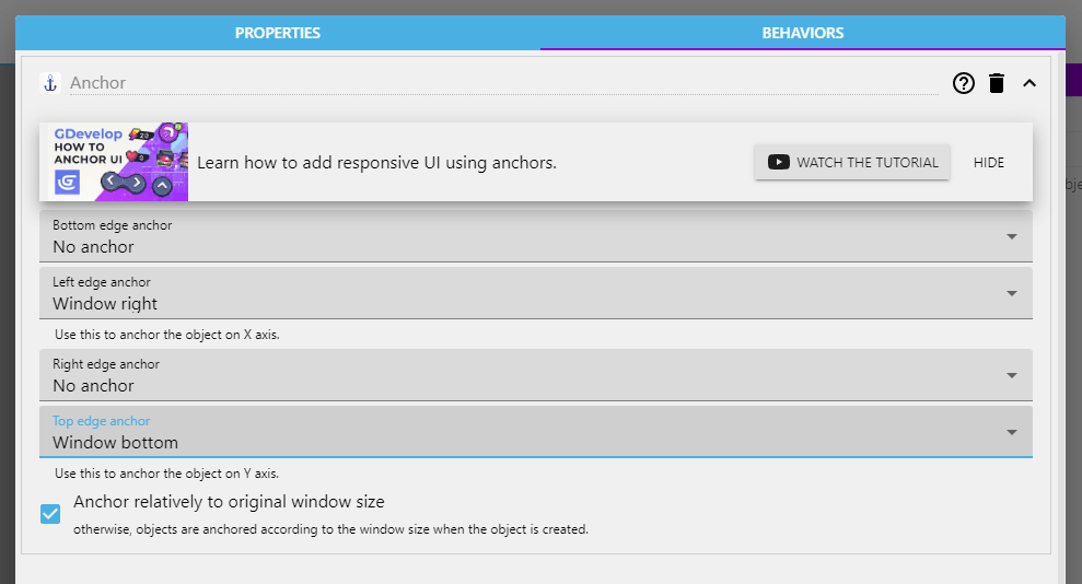 You can anchor an object to the screen by using anchor behavior to pin its edges (bottom, left, right, or top) to the window edges. Once anchored, if the screen size changes, the distance between the edge of the object and the edge of the window will stay the same. This is useful for static UI/HUD objects.