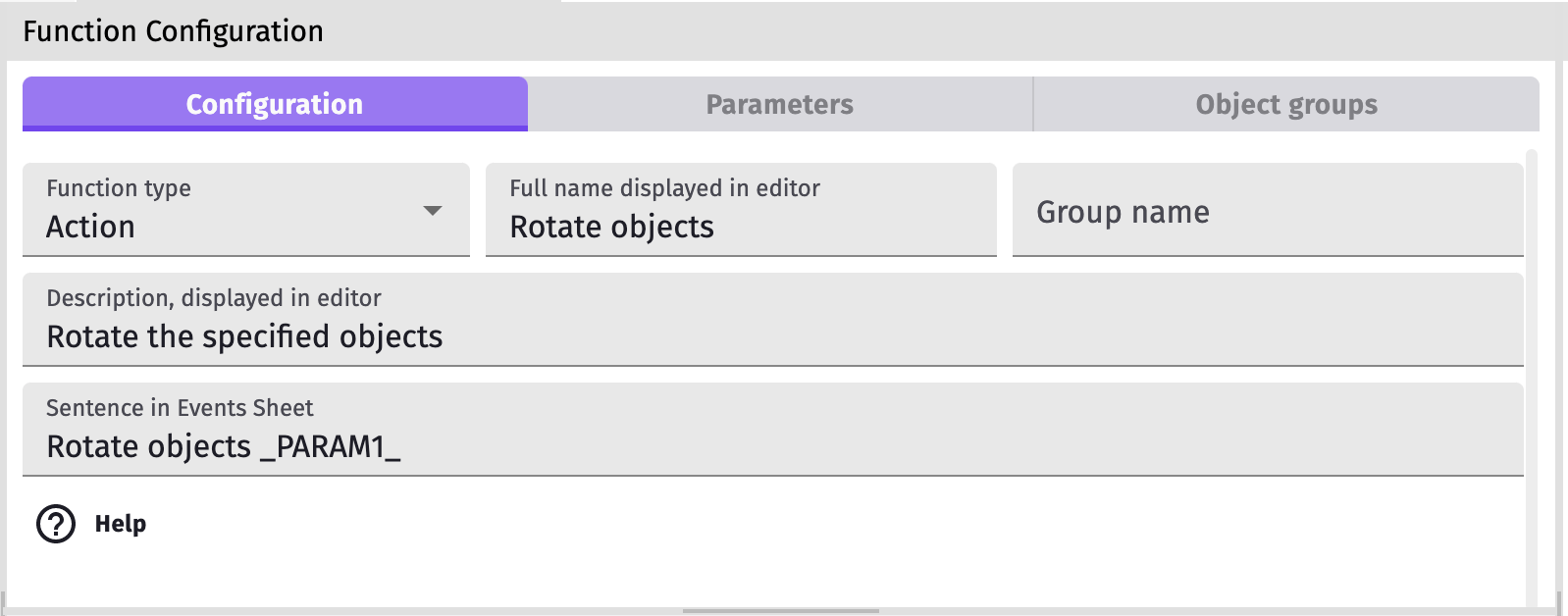 - Function type - actions and conditions can be used in events and expressions can be used in formulas.