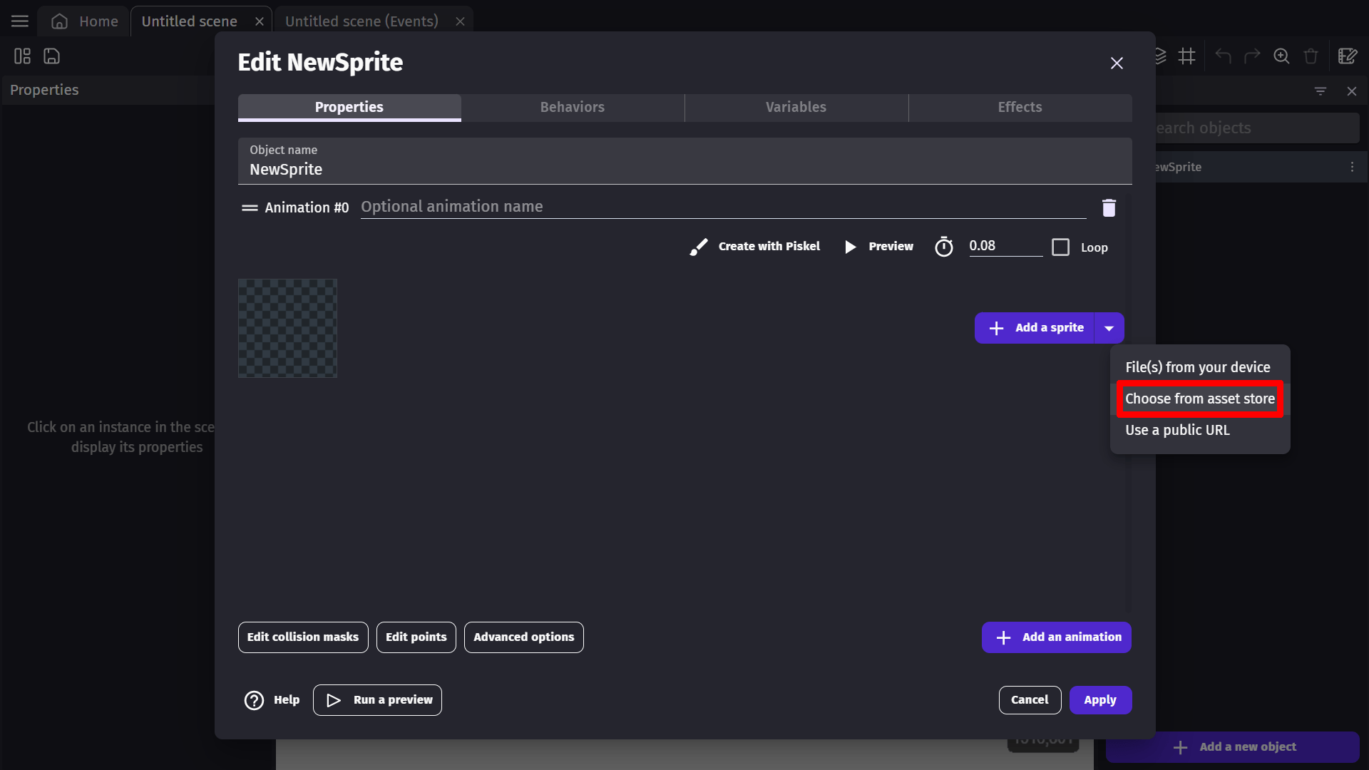If you'd rather get your assets from the asset store, you can click on the arrow beside the Add a Sprite button to open a drop down menu, where you'll be able to select choose from asset store.